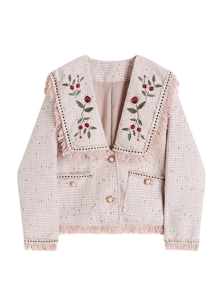 Arrive in style with this exclusive piece crafted with vintage style and lasting comfort. The long sleeve cardigan features a cozy, woven cotton-polyester fabric blend, floral embroidered frilled collar and...